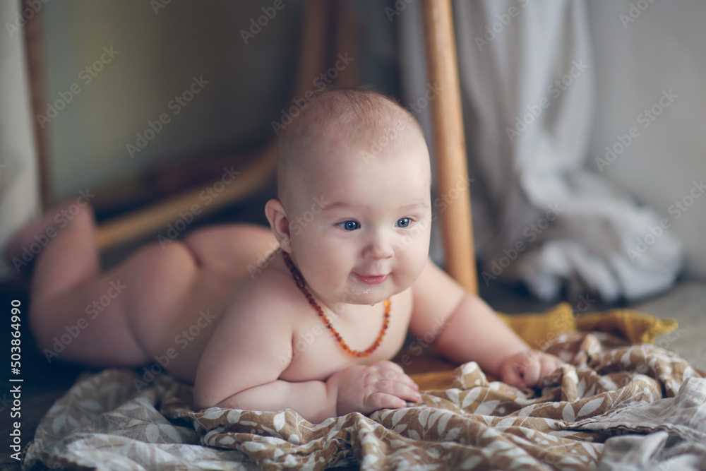 cute european baby 5 months old lies on a blanket on the floor. A child wearing amber teething beads in a real interior