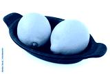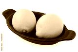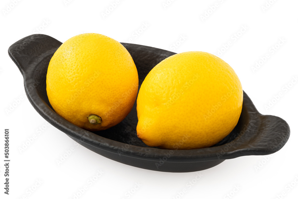Two whole fresh lemons on black dish.