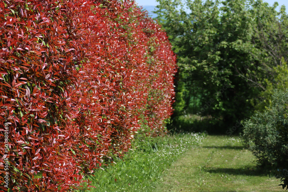 Photinia hedge with new red leaves on springtime. Photinia x fraseri in the garden