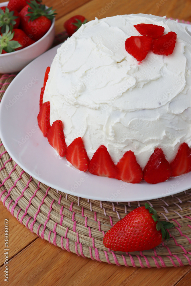 Zuccotto, traditional italian dome shaped cake with white chocolate cream and strawberries on wooden table. Charlotte cake with strawberries