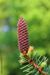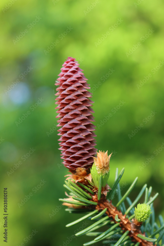Close-up of Pine or Spruce tree branches with fresh new cone buds in springtime