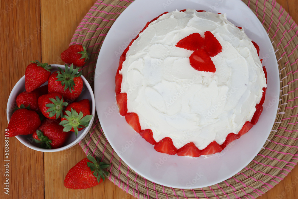 Zuccotto, traditional italian dome shaped cake with white chocolate cream and strawberries on wooden table. Charlotte cake with strawberries