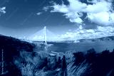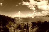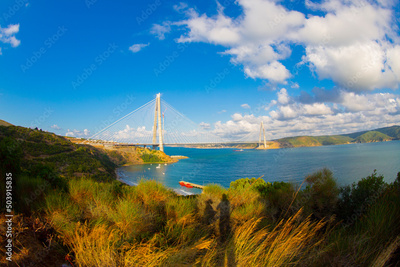 Yavuz Sultan Selim Bridge. Istanbul Bosporus view. Blue sea and sky. Modern bridge over the sea. Green meadow.