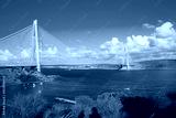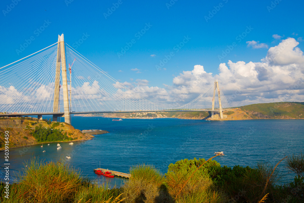 Yavuz Sultan Selim Bridge. Istanbul Bosporus view. Blue sea and sky. Modern bridge over the sea. Green meadow.