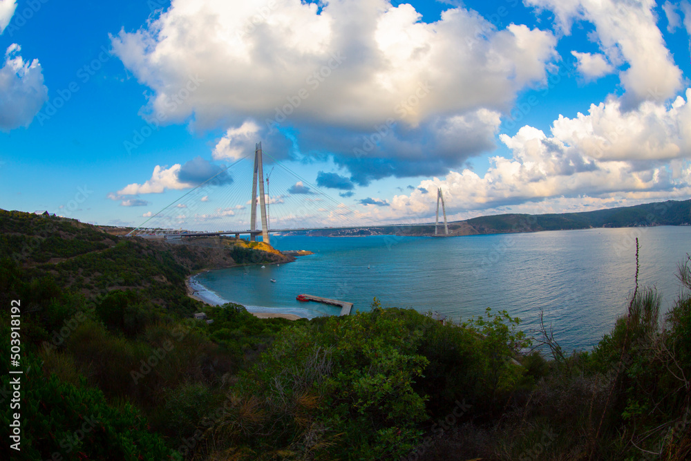 Yavuz Sultan Selim Bridge. Istanbul Bosporus view. Blue sea and sky. Modern bridge over the sea. Green meadow.
