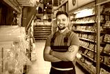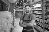 Confident friendly man working in warehouse in hypermarket of building materials. Smiling young male worker in coveralls standing with folded arms in one of aisles between shelves with goods.