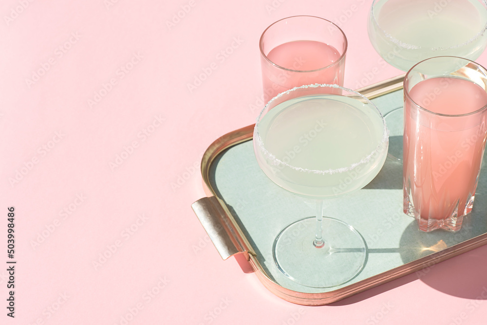 Summer cocktails based on fruit juice in pop art style on a vintage cute tray on a pink background.Vintage aesthetic, copy space