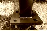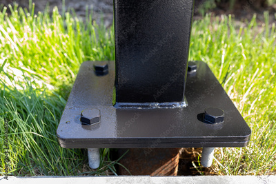 Metal pillar fastened to basement with anchor bolts and nuts. The support of the iron pillar.