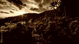 panoramic background of high mountain scenery, overlooking the atmosphere of the sea, trees and wind blowing in a cool blur, spontaneous beauty