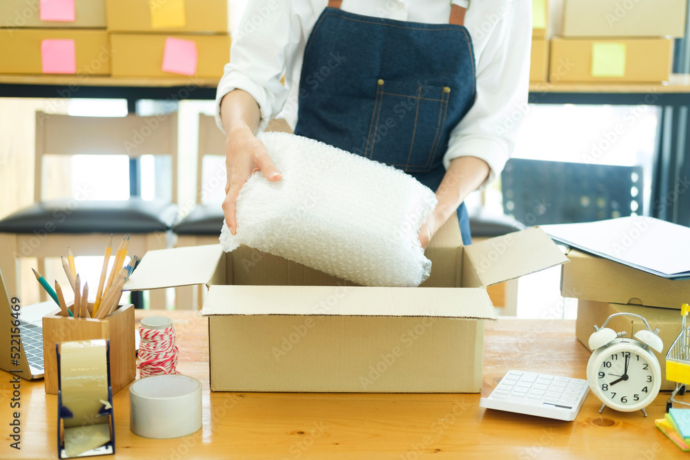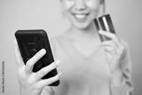 Young woman takes a photo of herself using a smartphone and credit card to pay online.