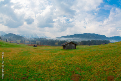 A scenic panorama of log cabins against a Geroldsee lake and the Karwendel mountains, Bavaria