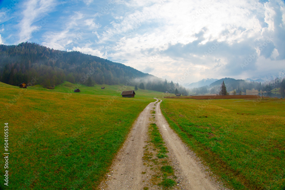A scenic view of log cabins against a Geroldsee lake and Karwendel mountains, Bavaria