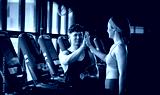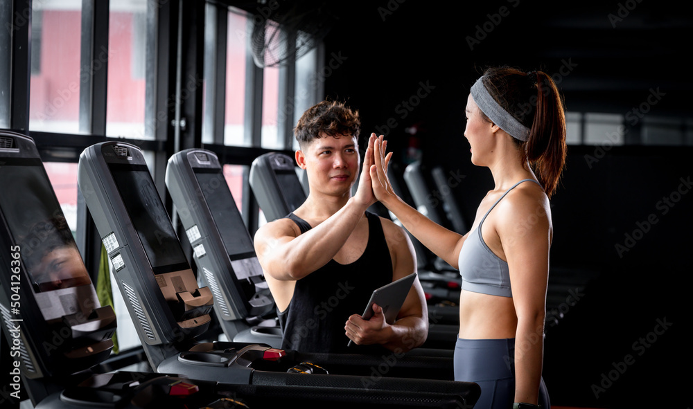Individual training with a trainer on a treadmill. The trainer controls correctness of the exercise when using a treadmill for cardio, trainer assisting with treadmill screen options at gym.