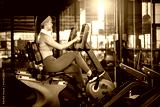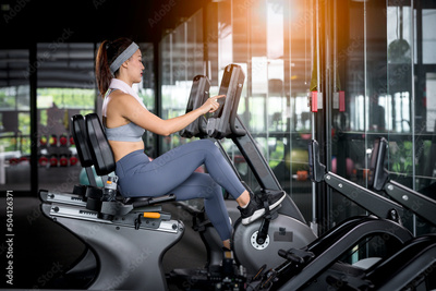Fitness woman wearing sportwear and workout headband on in the gym. Woman is setting setup machine stationary bike screen options at gym.