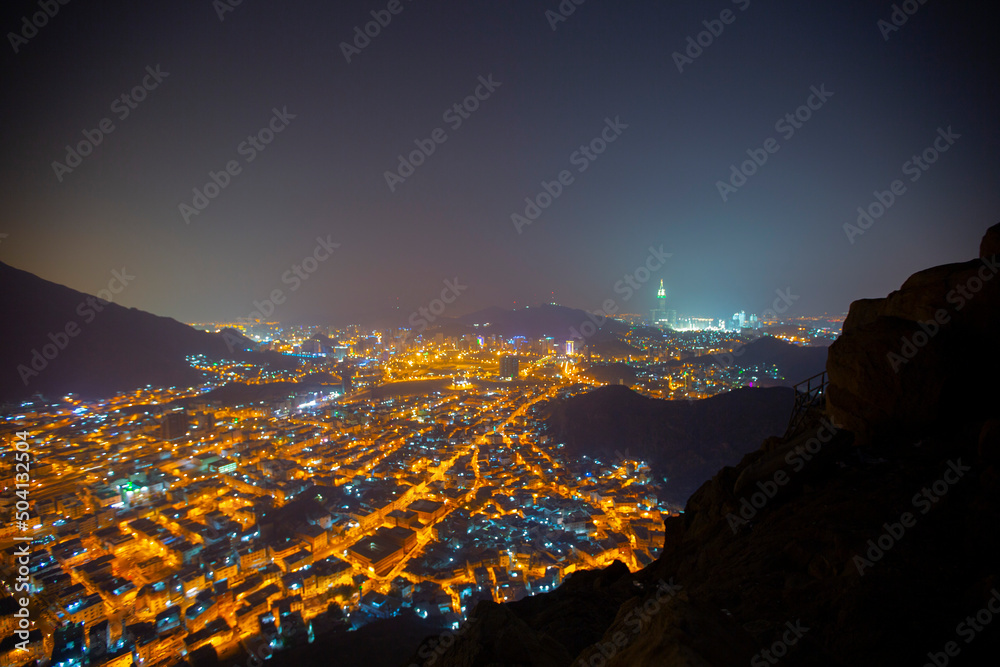 Skyline with Abraj Al Bait (Royal Clock Tower Makkah) in Makkah, Saudi Arabia. The tower is the tallest clock tower in the world at 601m (1972 feet).