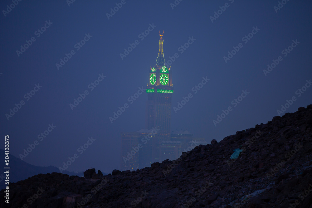 Skyline with Abraj Al Bait (Royal Clock Tower Makkah) in Makkah, Saudi Arabia. The tower is the tallest clock tower in the world at 601m (1972 feet).