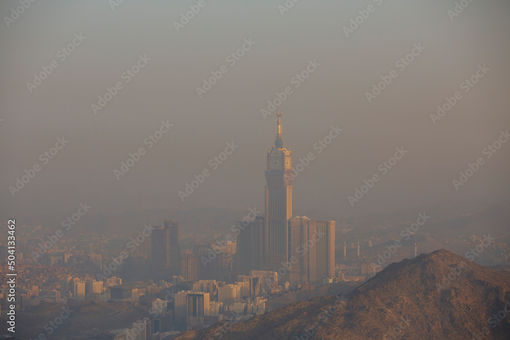 Skyline with Abraj Al Bait (Royal Clock Tower Makkah) in Makkah, Saudi Arabia. The tower is the tallest clock tower in the world at 601m (1972 feet).