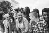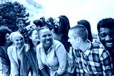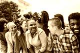 Young diverse people having fun outdoor laughing together - Focus on african girl face