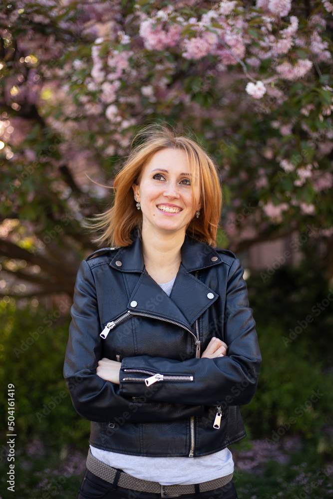 hipster woman in leather jacket near sakura blooming tree. Stylish girl smiling. Pink flowers, spring and youth concept