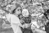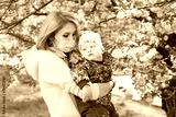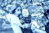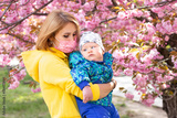 Mother in medical mask and little son in spring garden near blooming sakura trees
