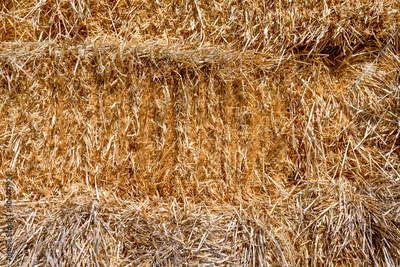 Texture of hay or straw collected in blocks. Hay or straw close-up. Agricultural background.