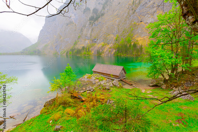 Schonau am Konigsee, Germany. Obersee lake in Berchtesgadener National Park. Watzmann mountain in the background.