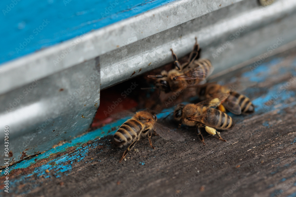 Close up view of wooden hive with honey bees on sunny day