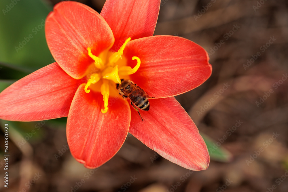 small Red tulip and bee collects nectar