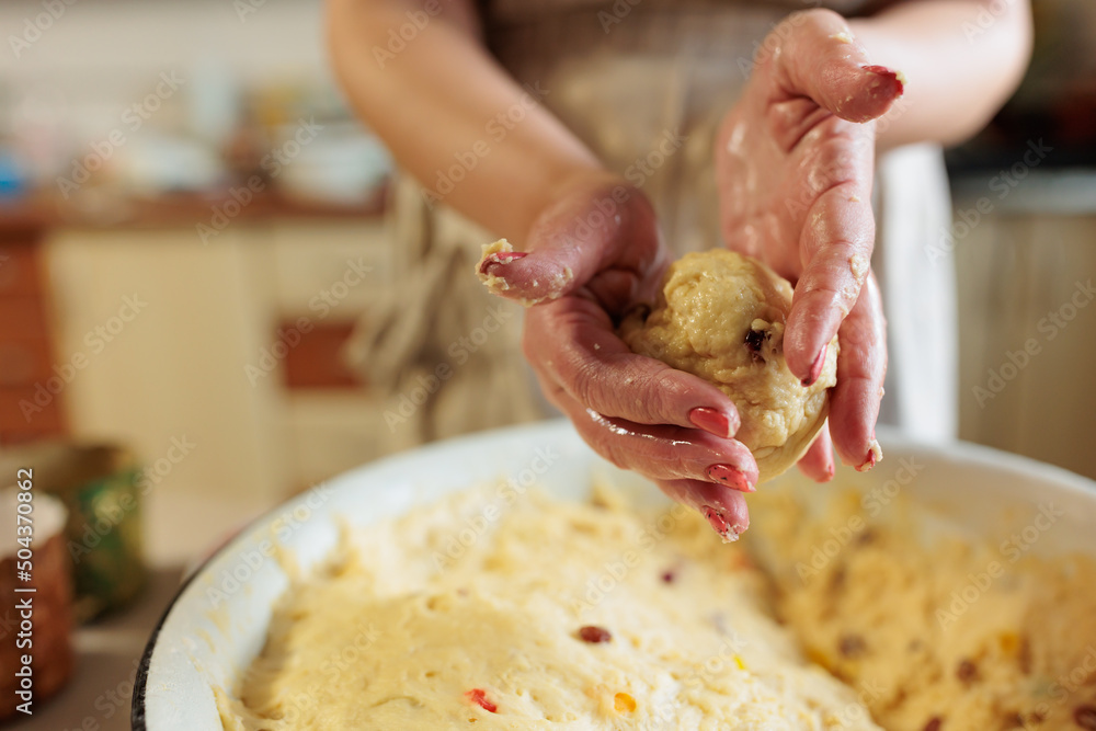 Culinary, cooking, baking concept. Female hands kneading dough, unrecognizable woman grandmother in apron cooking in kitchen, making pastry, cookies
