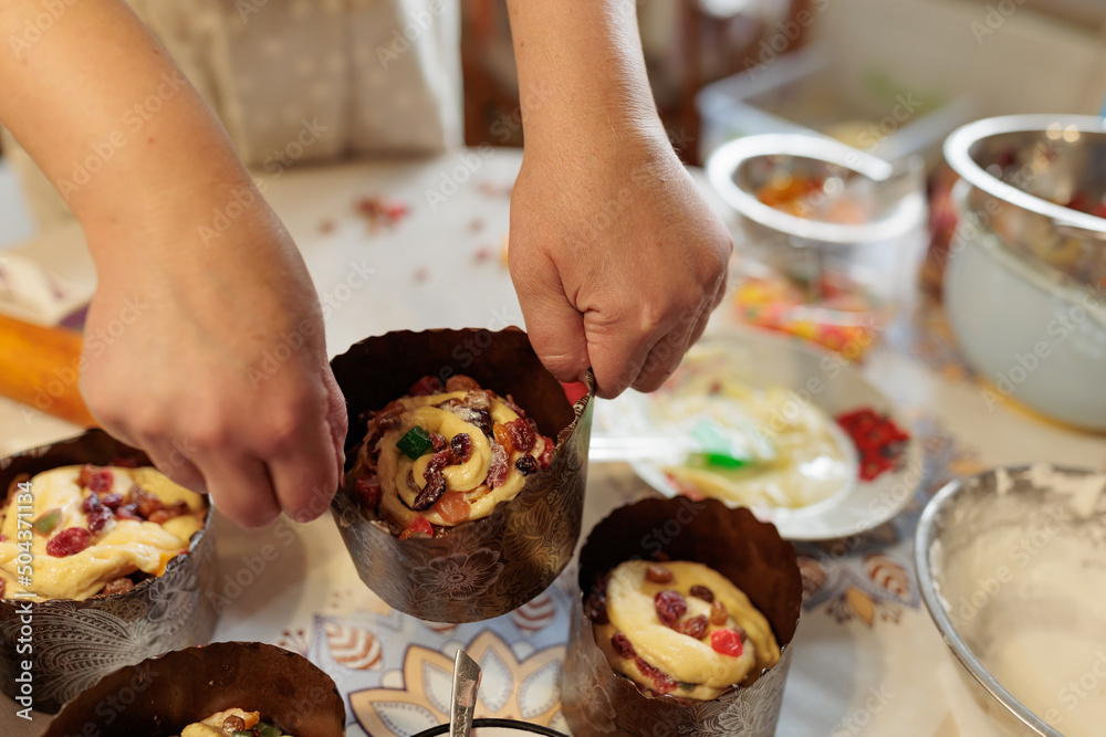 a woman cook lays out dough with candied fruits in paper molds for baking Easter cakes. family traditions and recipes. small family business and preparation of pastries