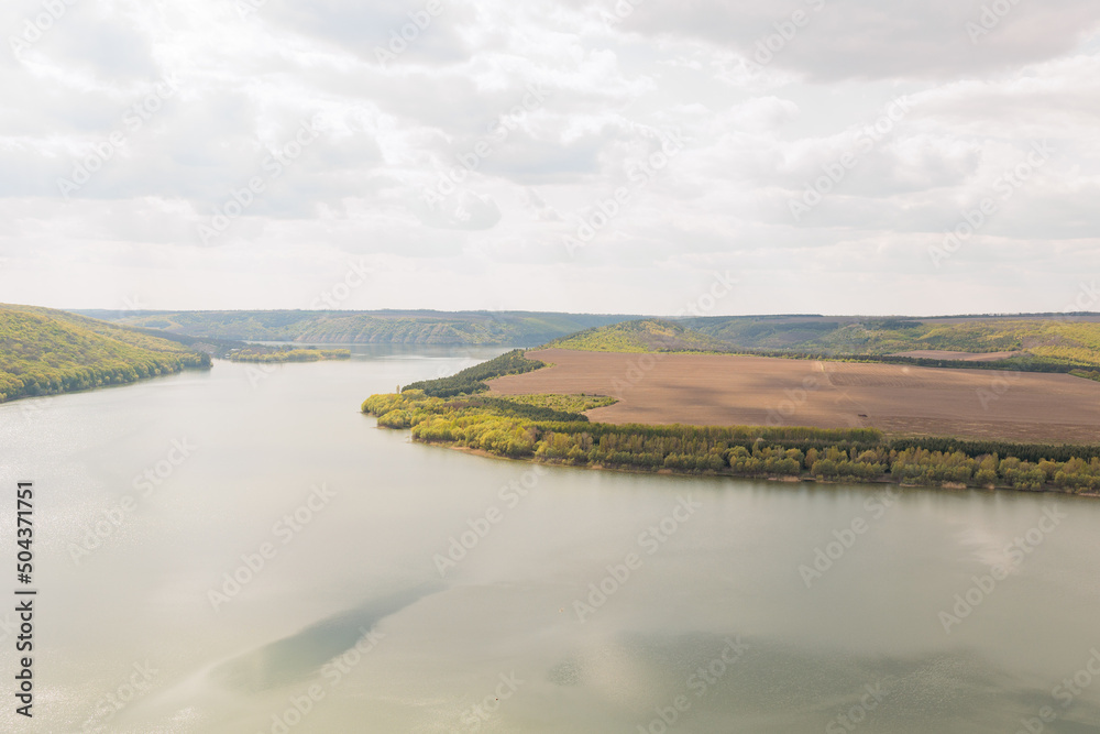 Magnificent aerial view, of the Dniester River with picturesque banks. Bakota