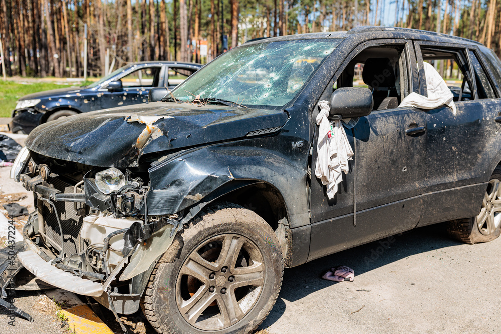 Many shot and destroyed cars at the car graveyard in Irpin, Ukraine.