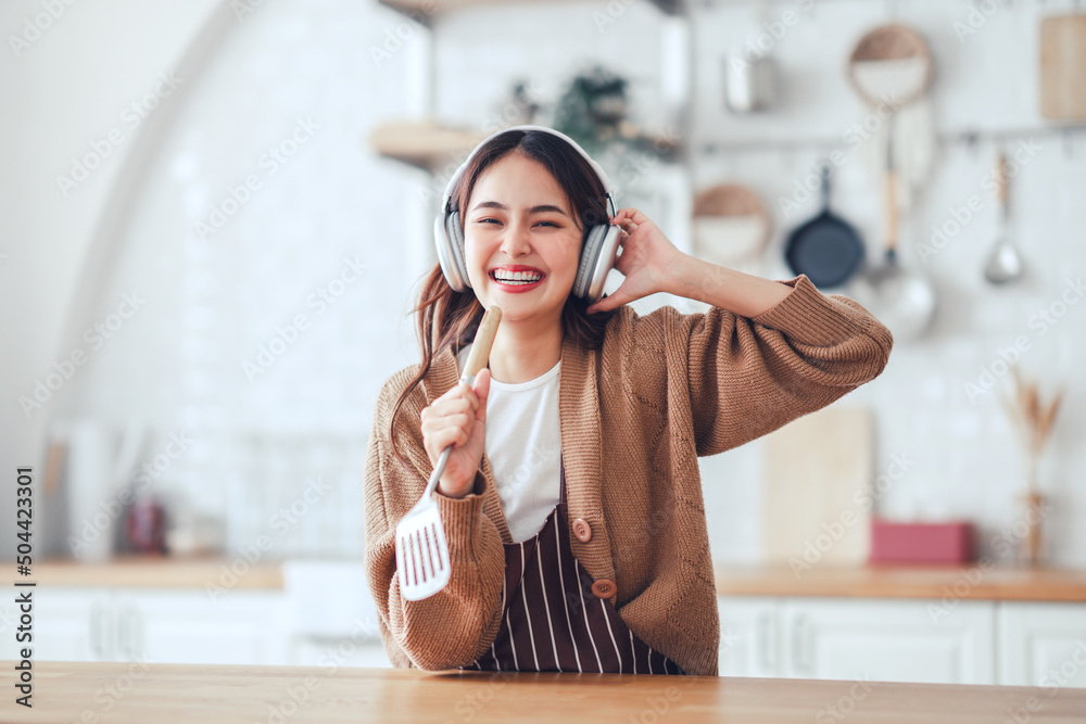Happy carefree asian woman wearing headphones and ladle singing have fun moving listening to music relax in kitchen, She dance enjoy leisure weekend at home.