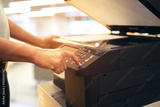 Copiers printer, Close up hand office man press copy button on panel to using the copier or photocopier machine for scanning document printing a sheet paper and xerox photocopy.