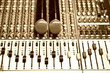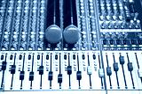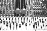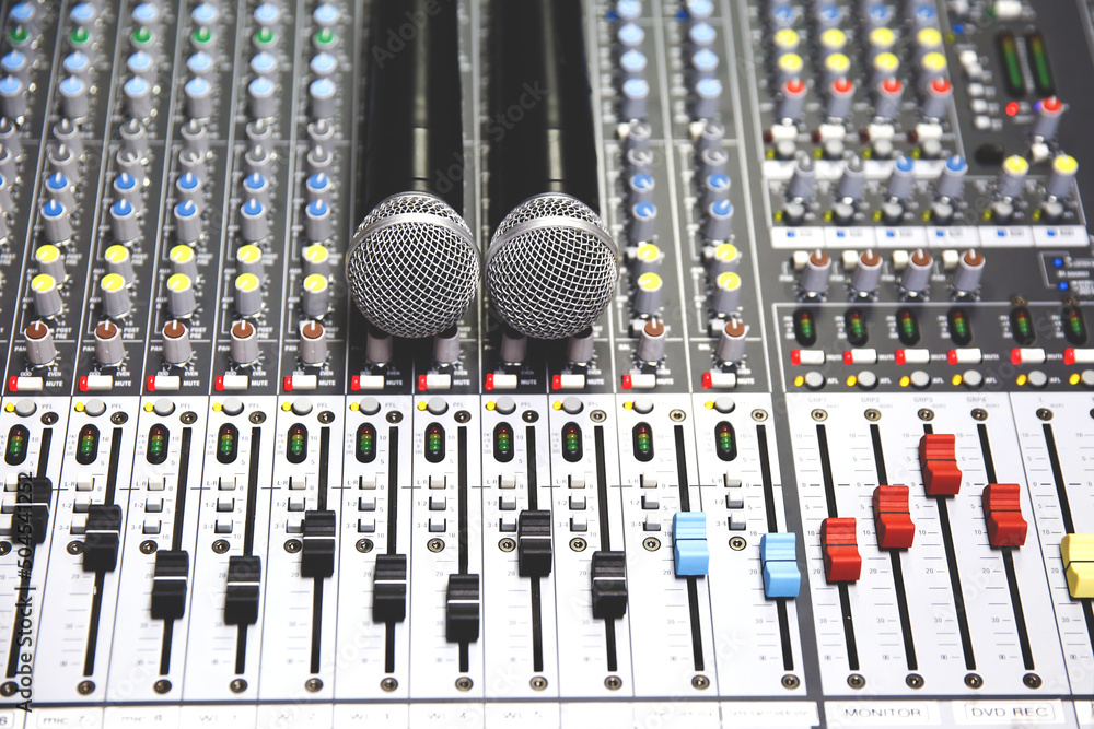 Close-up microphone and sound mixer in studio for sound record control system and audio equipment and music instrument