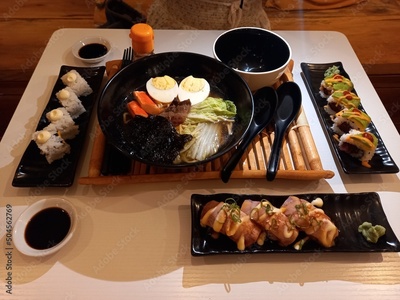 Japanese Meal (Ramen and Sushi) in Restaurant