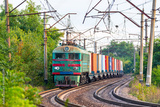A powerful green locomotive pulls a long train of wagons with containers to the railway station for loading onto a ship. Close-up view.