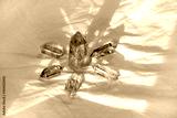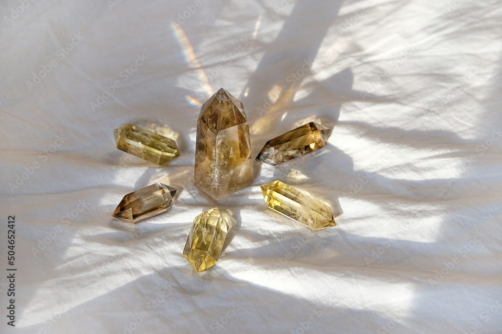 Quartz crystals Altar Kit on abstract fabric background. minerals for Crystal Ritual, Chakra Relaxation, Wiccan Witchcraft, esoteric spiritual practice. reiki healing therapy