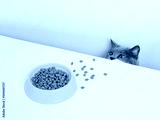 A cute gray cat and a bowl of food on a yellow background. Reaching for his favorite food, little thief.