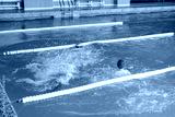 A group of boys and girls play, jump into the water in a modern pool. Development of children's sports. Healthy parenting and promotion of children's sports.