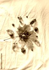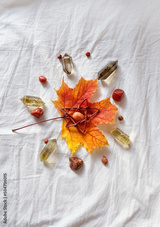 minerals and autumn maple leaf on fabric background. wicca mandala for fall season. witch magic ritual with gemstones for Mabon, thanksgiving holiday, Halloween. top view