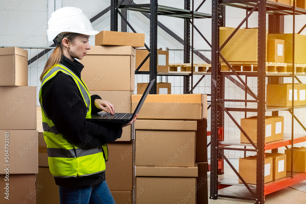 Customs clearance. Girl with laptop in warehouse. Woman works at customs. Woman is using portable computer. Passage of goods across border. Customs officer in reflective vest. Female warehouse rack
