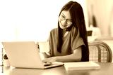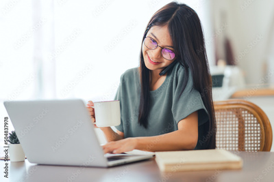 Shot of a multi-tasking young asian woman having a drinking coffee and using laptop and smartphone while work.