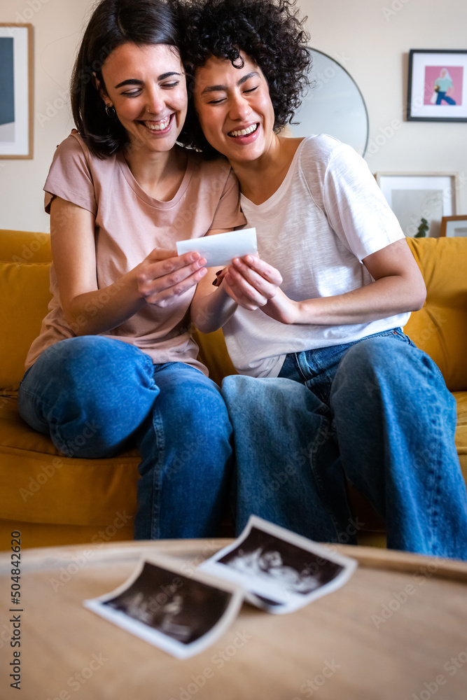 Happy multiracial lesbian pregnant couple looking the first baby ultrasounds at home. Vertical image.