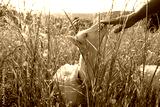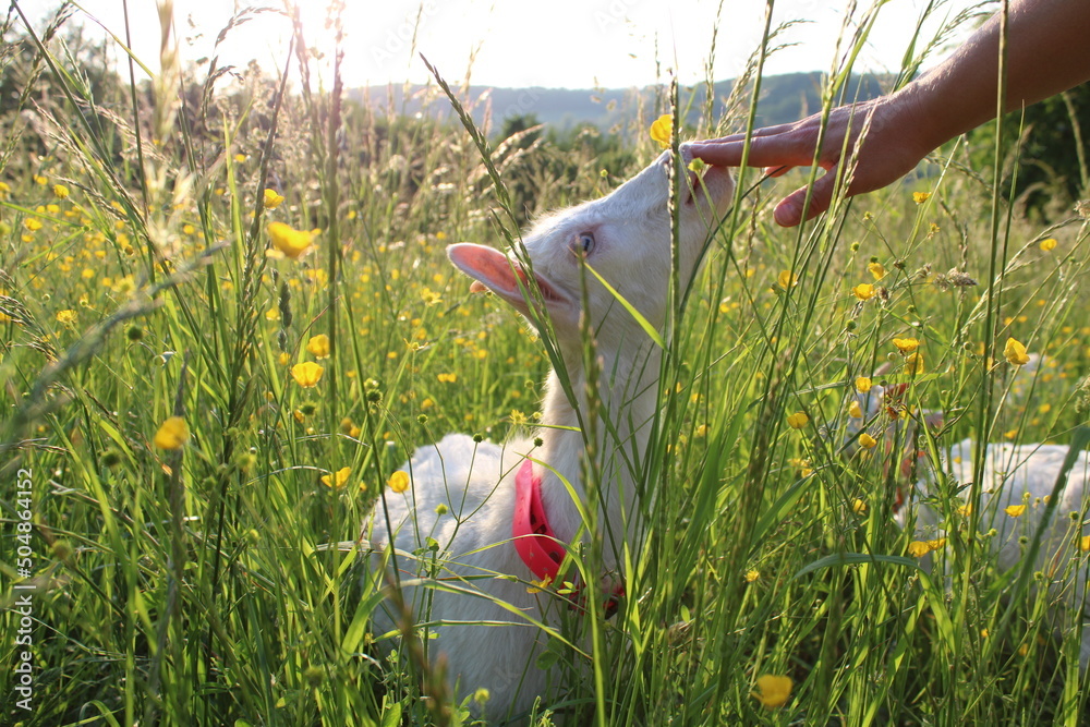 Chèvre blanche dans le pré, avec main de l'homme caressant la chèvre, amour de l'élevage