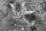 Deux chats tigrés dans l'herbe qui font des bisous, des câlins