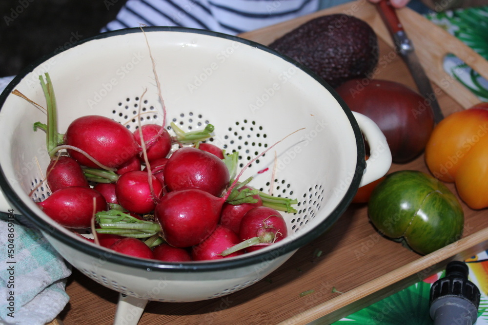Gros radis rond et rouge, cueillette du jardin, arrière plan de légumes et variété ancienne