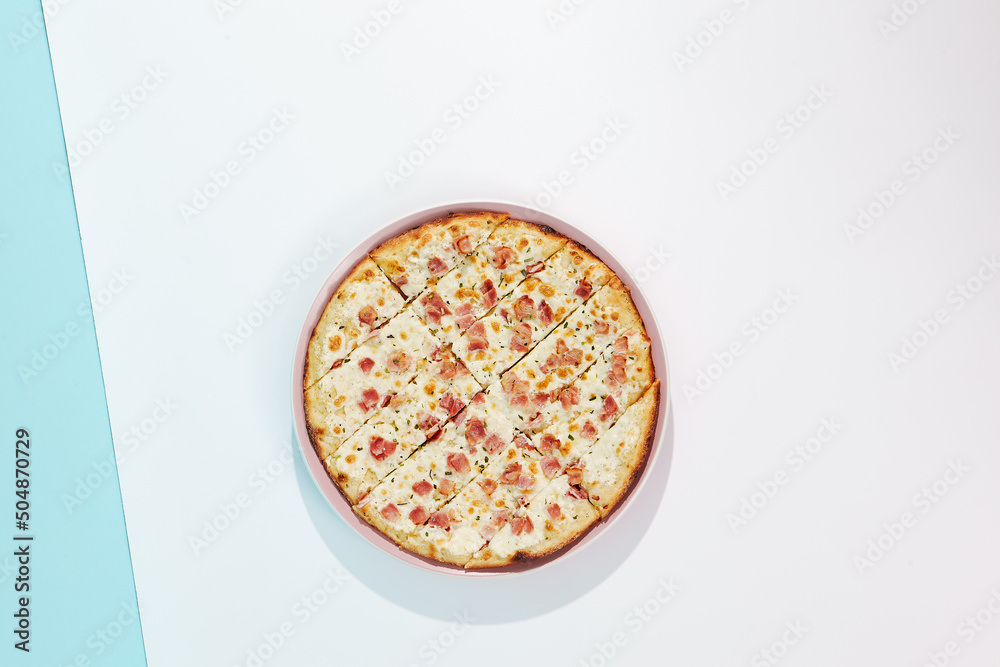Italian pizza with bacon and cheese on coloured background. Cheese focaccia with bacon in minimal style on blue colour. American pizza delivery concept with color backdrop