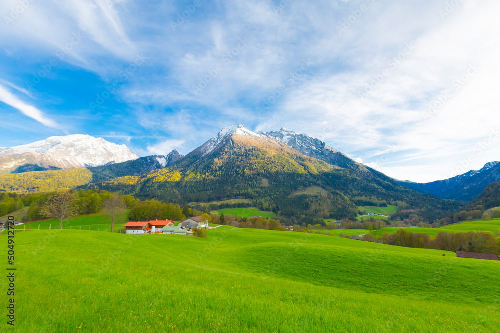 Beautiful scene of trees near turquoise water of Hintersee lake.