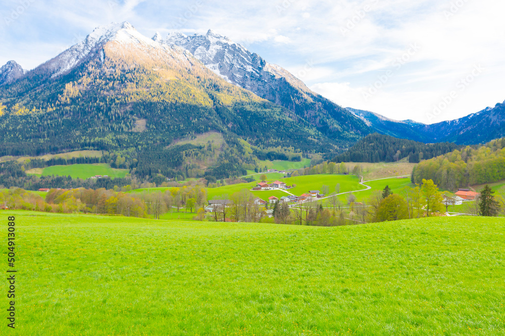 Beautiful scene of trees near turquoise water of Hintersee lake.
